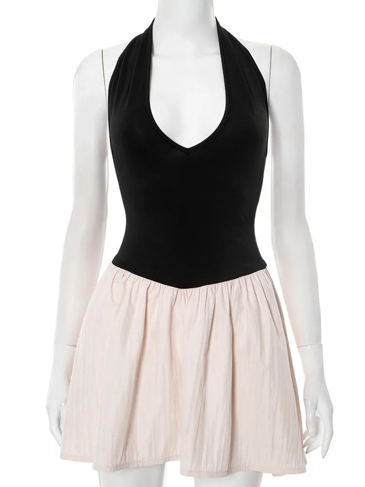 minus Halter V Neck Sexy Mini Dress Women Patchwork Contrast Colors Sleeveless Backless High Waist A-line Club Dress 2025