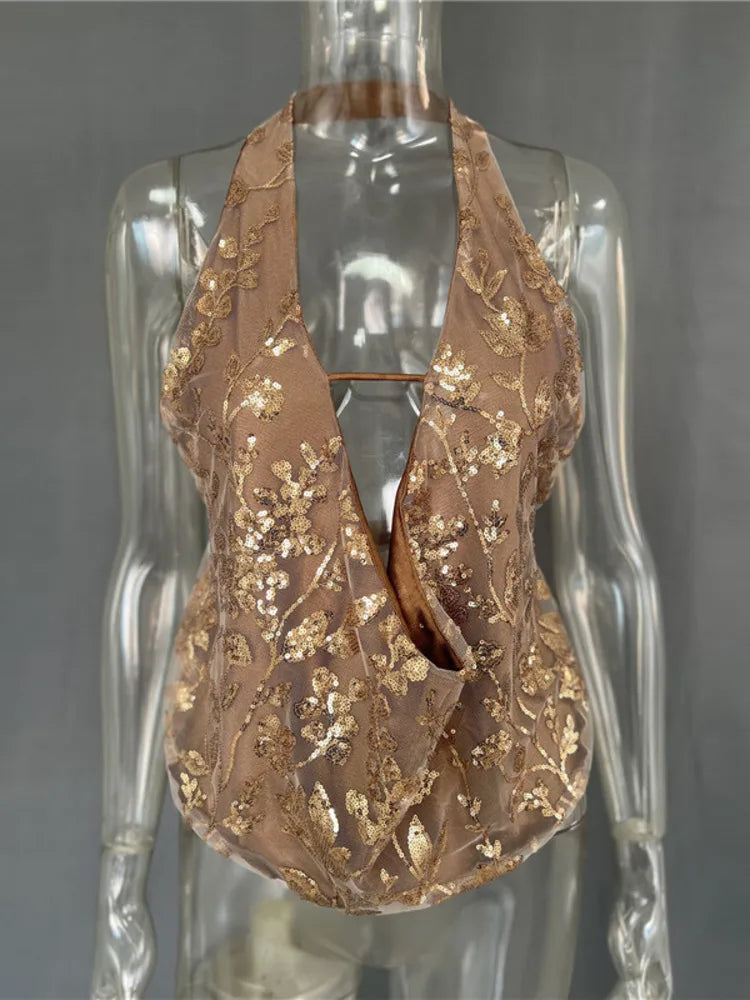 Glitter Deep V Neck Sexy Tank Tops Women Vest Pullovers Summer New Sparkle Backless Cropped Tops Elegant Beach Tops
