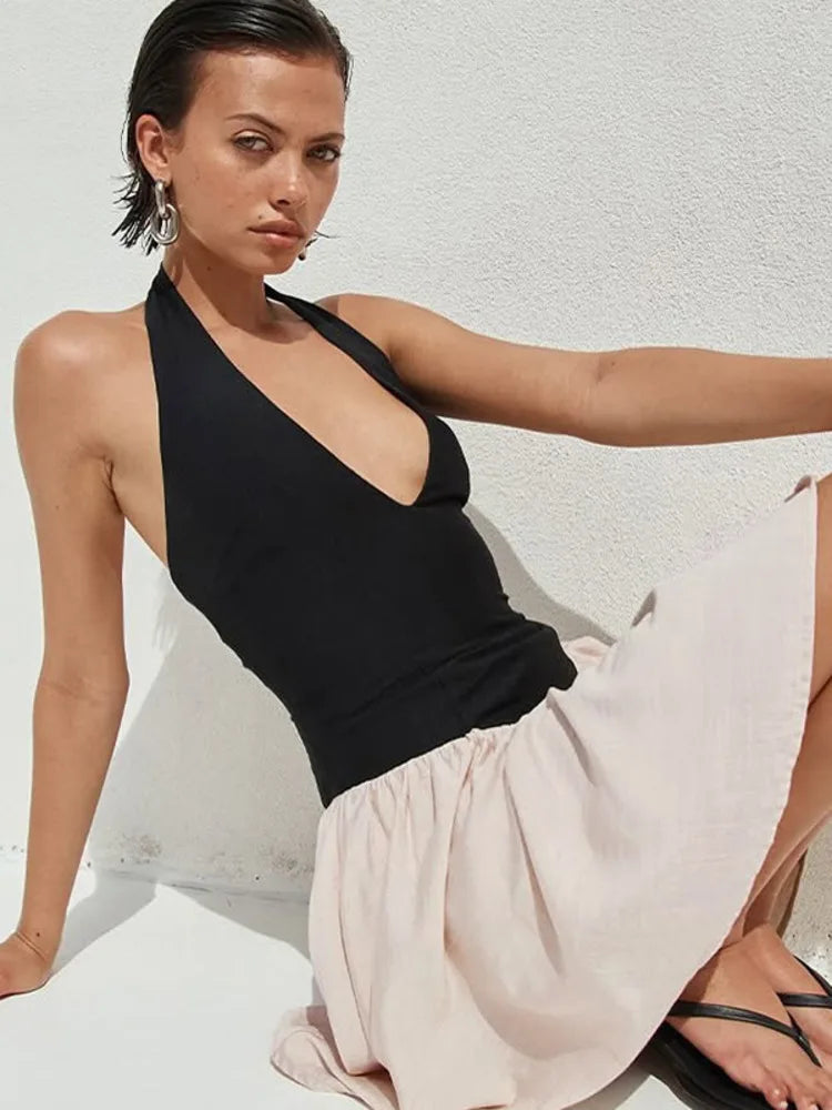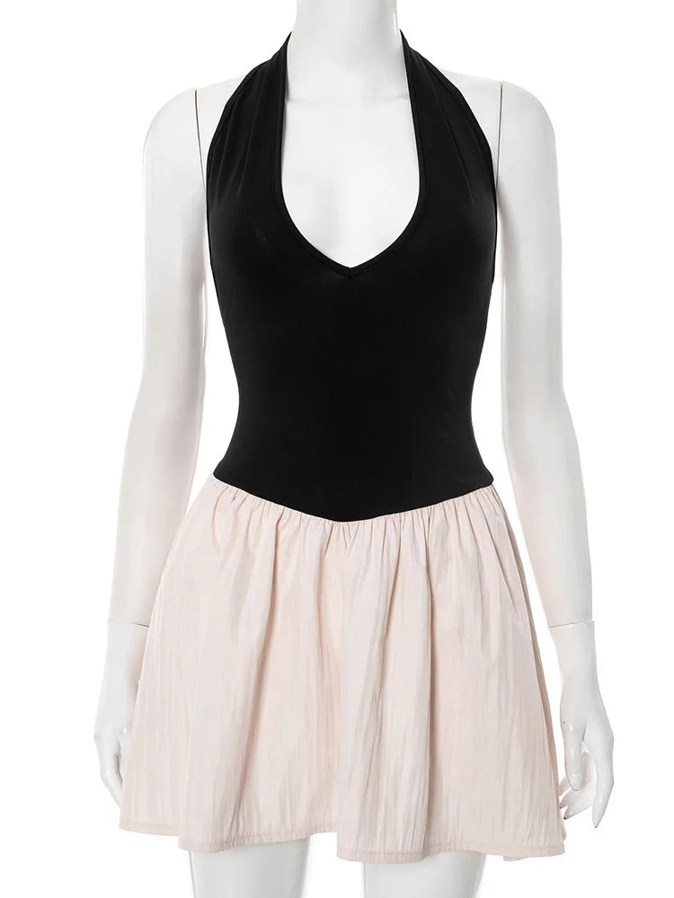 minus Halter V Neck Sexy Mini Dress Women Patchwork Contrast Colors Sleeveless Backless High Waist A-line Club Dress 2025